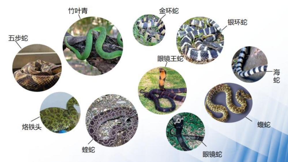 据统计,广东共有蛇类6科50属93种,其中毒蛇有33种,最为常见的有竹叶青蛇、银环蛇、眼镜蛇、眼镜王蛇、五步蛇等。竹叶青蛇是广东岭南以南活动最频繁,也是致伤人数最多的毒蛇。